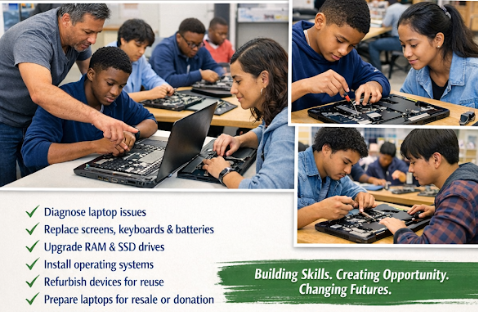 Our hands-on technology training sessions equip students with practical skills in laptop diagnostics, repair, and refurbishment. Participants gain real-world experience while learning the fundamentals of hardware, software installation, and device restoration.